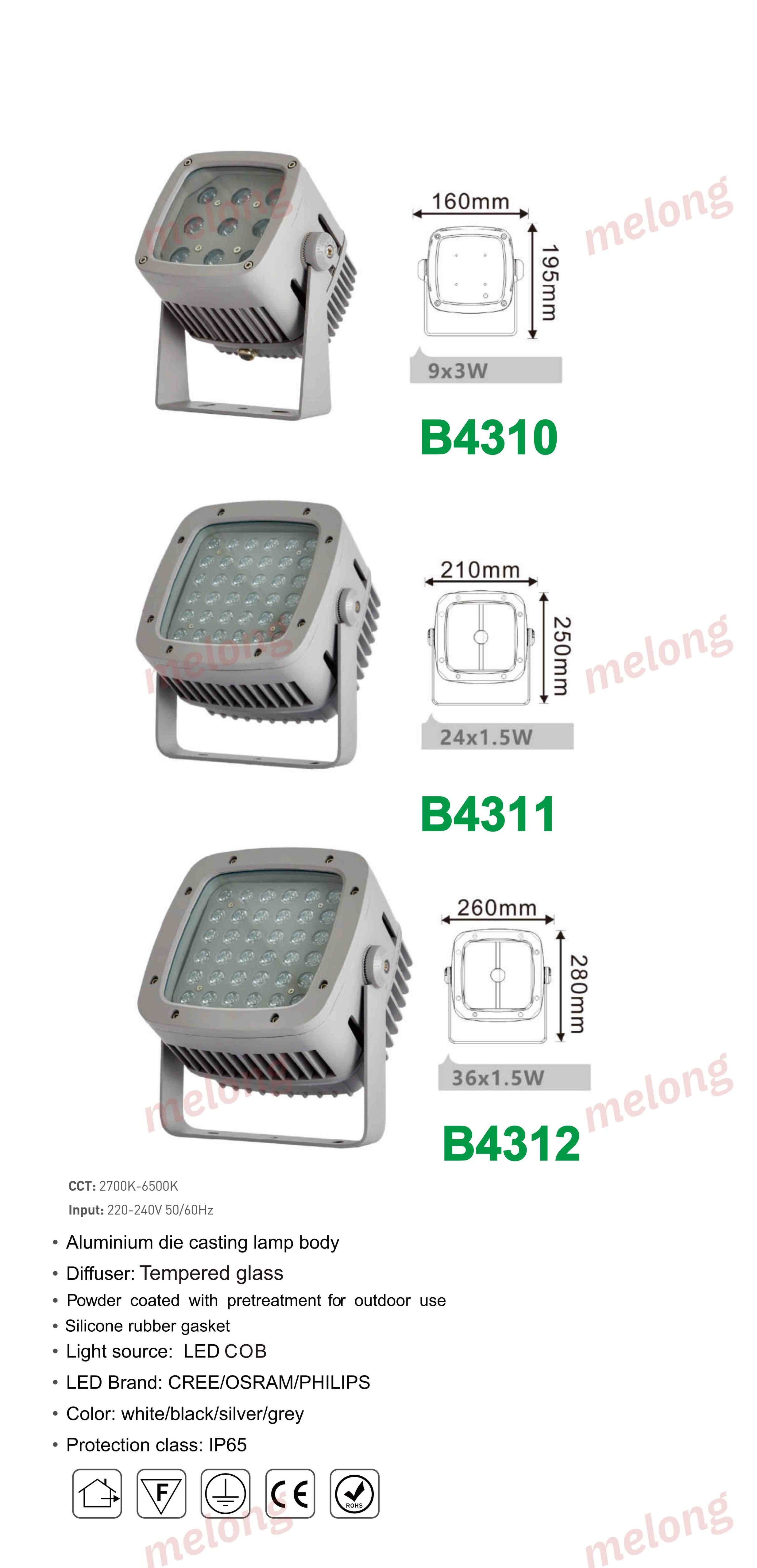 Item:B4312 Material: Die-cast Aluminum Light Source: LED Waterproof: IP65 Voltage: 110–240V Color Temperature: 3000K / 4000K / 6000K Suitable for Garden/Villa/Courtyard/Pathway/Exterior Wall
