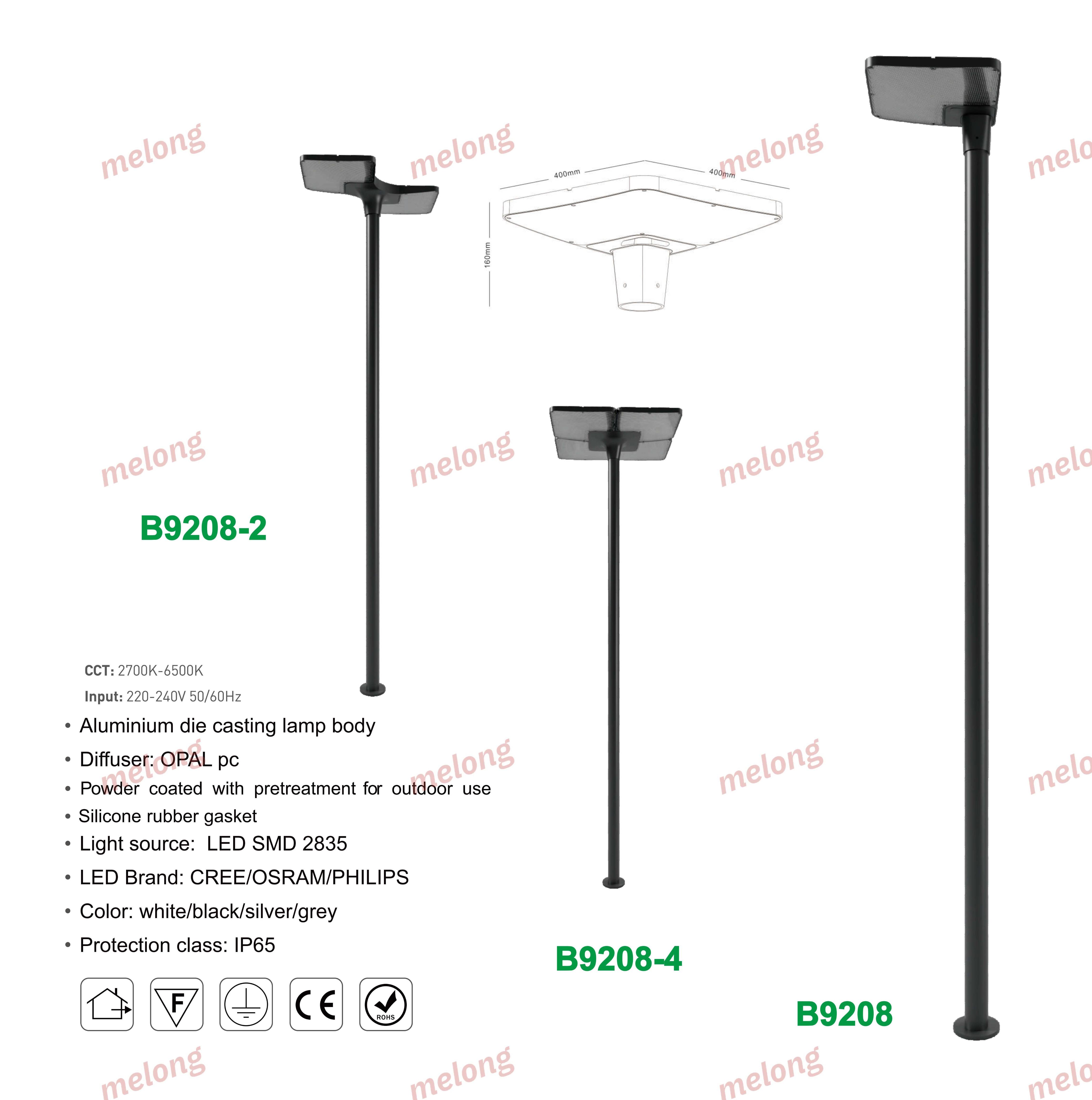 Item:B9208 Material: Die-cast Aluminum Light Source: LED Waterproof: IP65 Voltage: 110–240V Color Temperature: 3000K / 4000K / 6000K Suitable for Road, Highway, Square, Community, Parking Lot