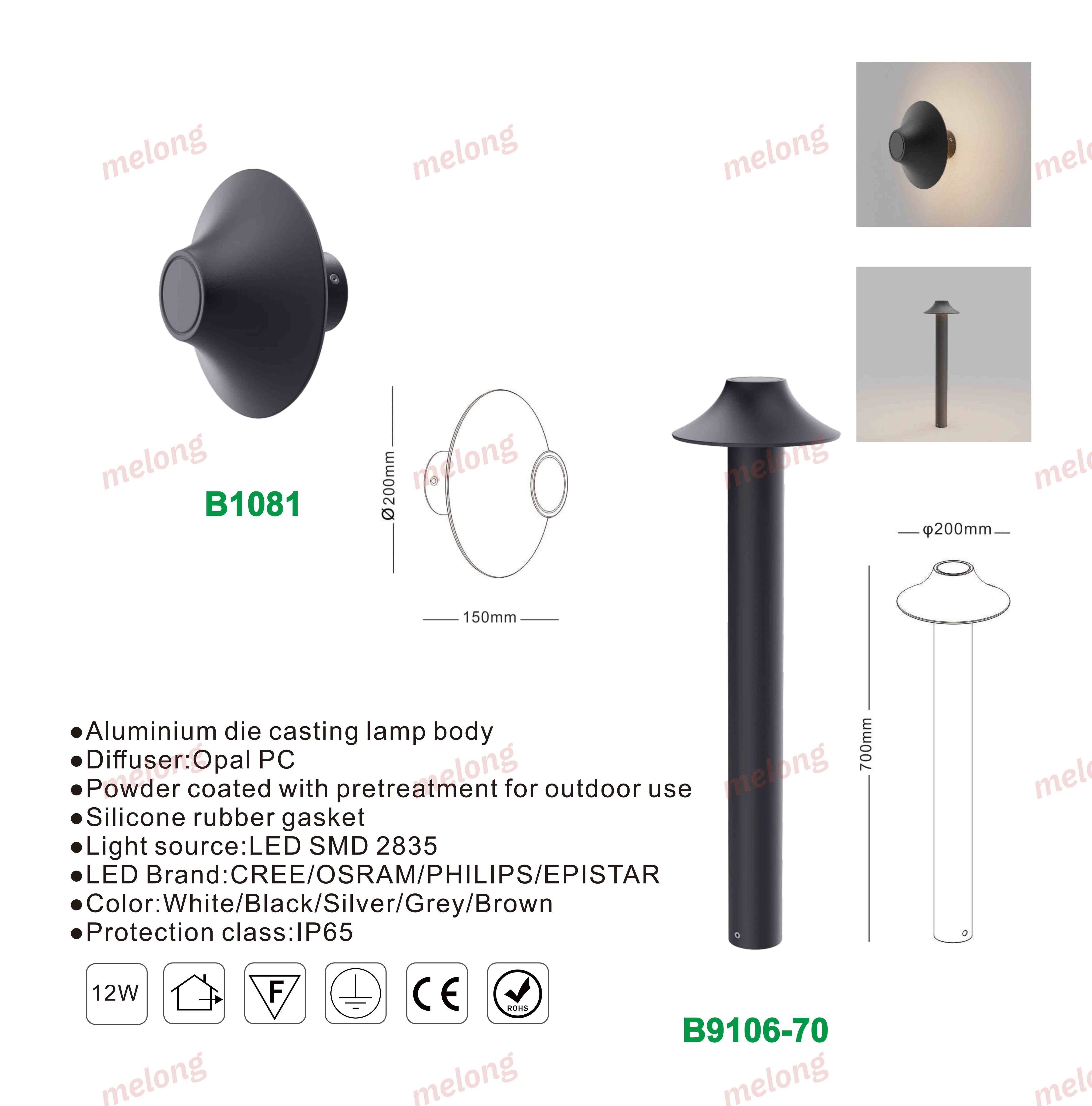 Item:B9106-70 Material: Die-cast Aluminum Light Source: LED Waterproof: IP65 Voltage: 110–240V Color Temperature: 3000K / 4000K / 6000K Suitable for Garden/Villa/Courtyard/Pathway