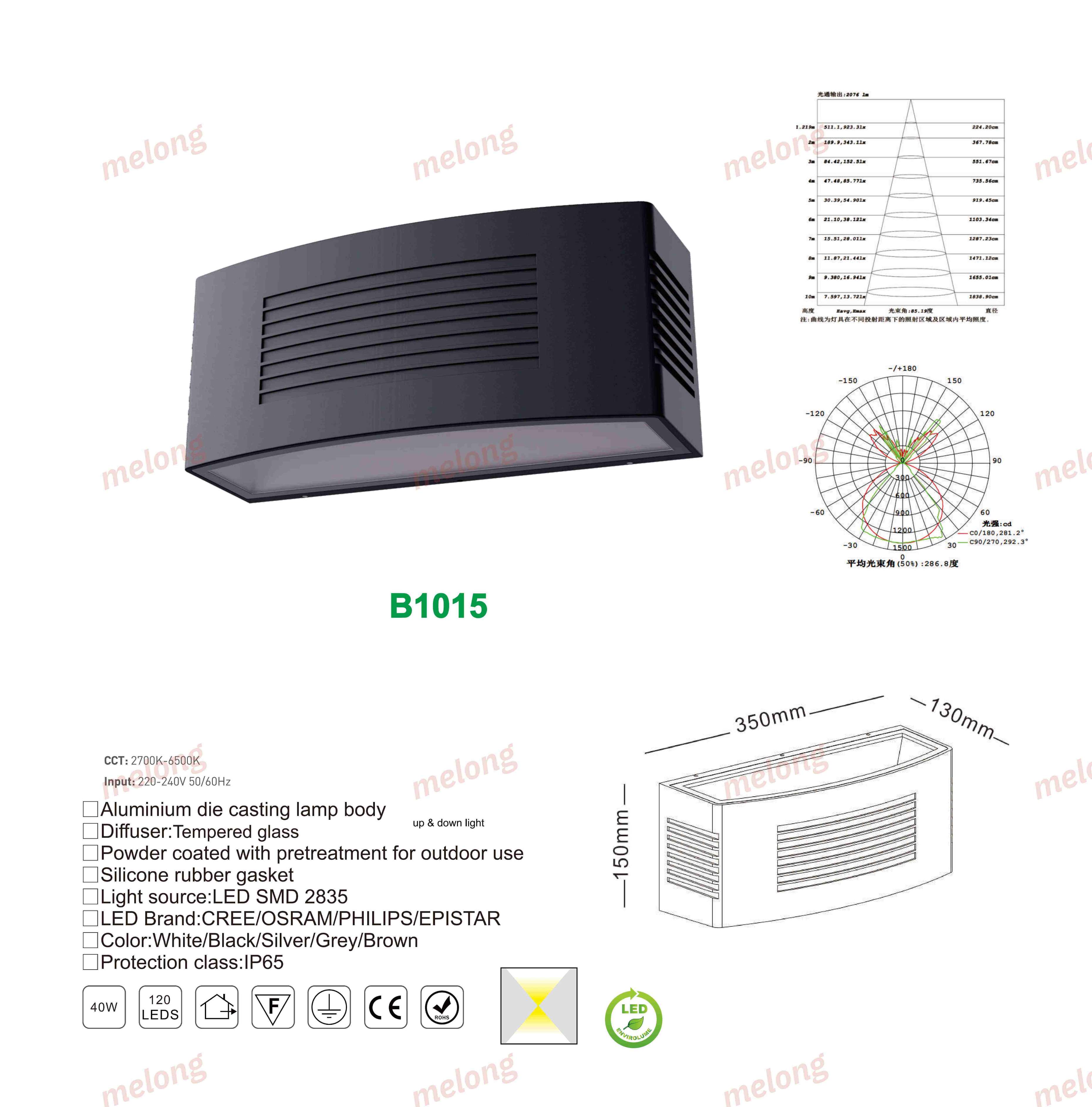 Item:B1015 Material: Die-cast Aluminum Light Source: LED Waterproof: IP65 Voltage: 110–240V Color Temperature: 3000K / 4000K / 6000K Suitable for Garden/Villa/Courtyard/Pathway/Exterior Wall